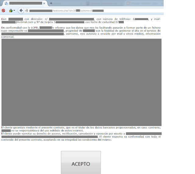 La empresa auditada genera una llamada telefónica hacia el cliente con el fin de venderle su servicio, cuando el cliente accede a contratar el mismo recibe un SMS donde se le redirige a una URL con sus datos y el contrato para aceptar como podemos ver a continuación.